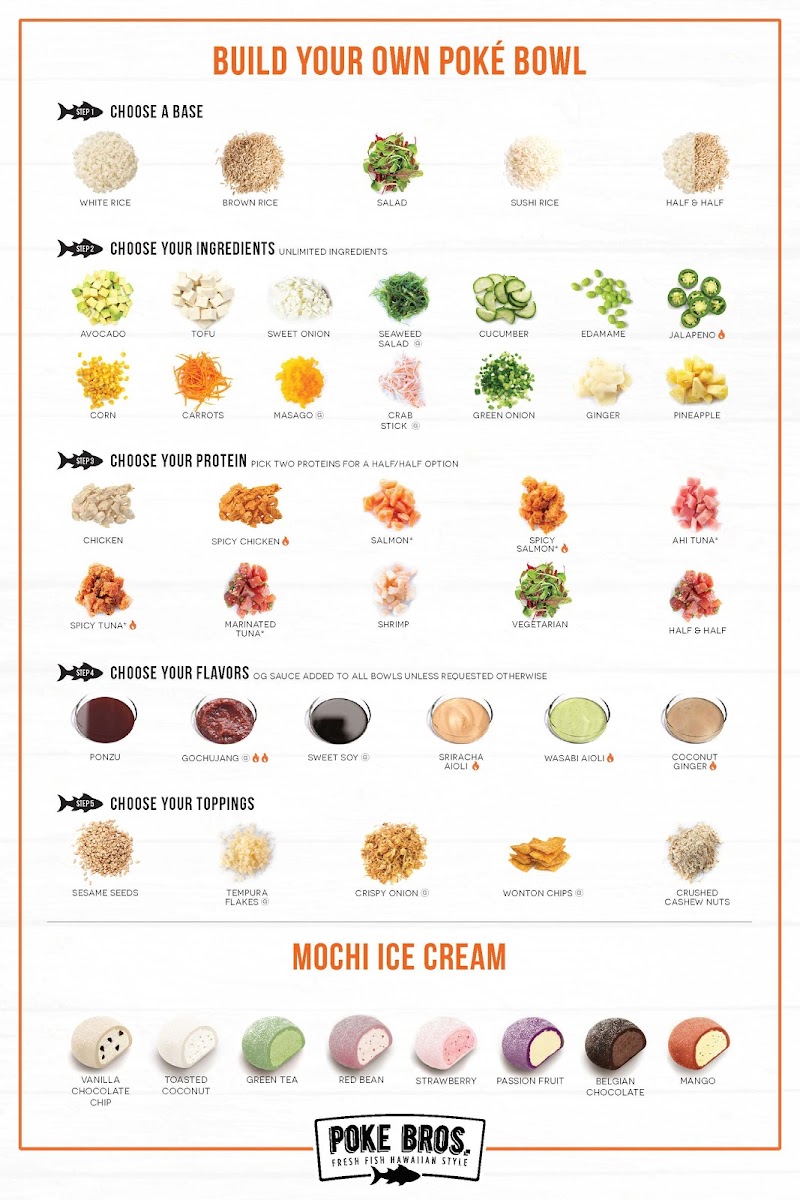 The best option for the adventurous fresh seafood lover is to craft your own Poke Bowl while you're in line or ordering online. It's easy, just start with a Base (choice of white, brown, or sushi rice, or salad), then pick your primary Protein (Chicken, Spicy Chicken, Salmon, Spicy Salmon, Ahi Tuna, Spicy Tuna, Marinated Tuna, Shrimp, or Tofu). Then add all the veggie toppings to your taste, including Avocado, Sweet Onion, Seaweed Salad, Cucumber, Edamame, Jalapeno, Corn, Carrots, Masago, Crab Stick, Green Onion, Ginger, and Pineapple. Flavor it with one of our 6 signature sauces (OG Sauce, Ponzu, Gochujang, Sweet Soy, Sriracha Aioli, Wasabi Aioli, & Coconut Ginger) and get some crunchy toppings to complete the dish (Sesame seeds, Tempura Flakes, Crispy Onion, Wonton Chips, Toasted Coconut, or Crushed Cashew Nuts). However you like it, that's how we bowl!